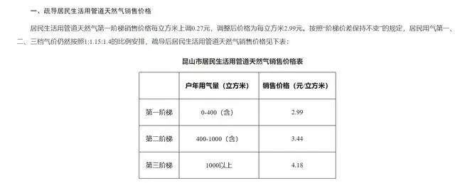 該通知中稱,為疏導上游氣源價格上漲矛盾,按照崑山市居民用氣價格上下游聯動機制規定,經市政府同意,居民生活用管道天然氣第一階梯銷售價格每立方米上調0.27元,調整後價格為每立方米2.99元。按照“階梯價差保持不變”的規定,居民用氣第一、二、三檔氣價仍然按照1:1.15:1.4的比例安排。自2023年11月1日起,按調整後的價格標準執行。