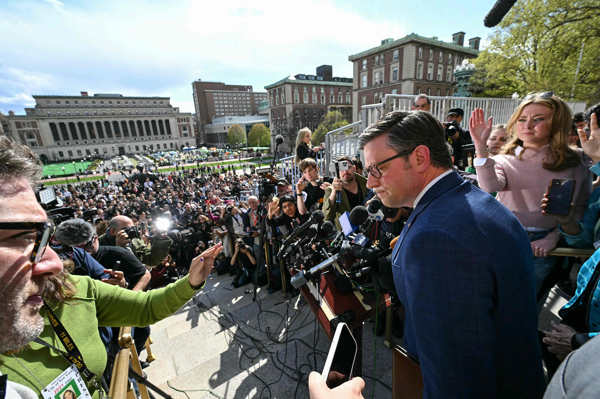 當地時間4月24日,美國眾議院議長邁克·約翰遜在哥倫比亞大學召開記者會 圖源:視覺中國