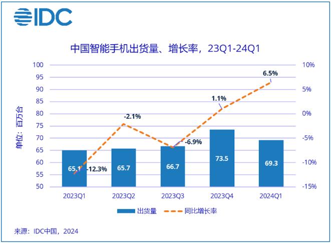 據Counterpoint的手機銷量周度報告數據,2024年第一季度中國智能手機銷量同比增長1.5%,連續第二個季度實現同比正增長。(銷量是指實際被消費者購買並收到的商品數量。)