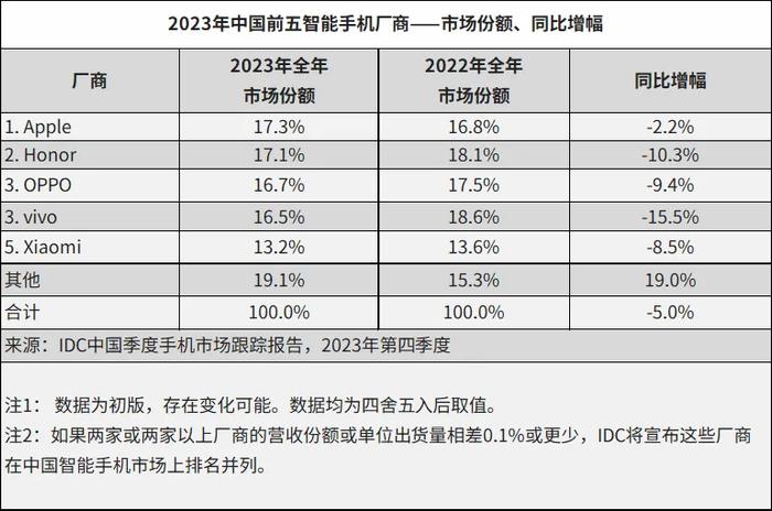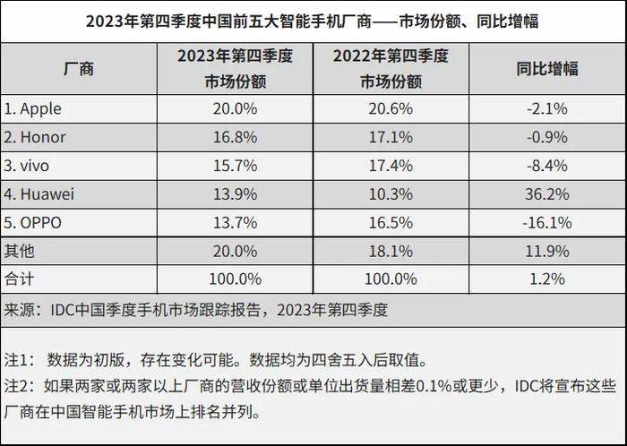 值得注意的是,2023年第四季度和2023年全年,Apple出貨量排名國內市場首位。