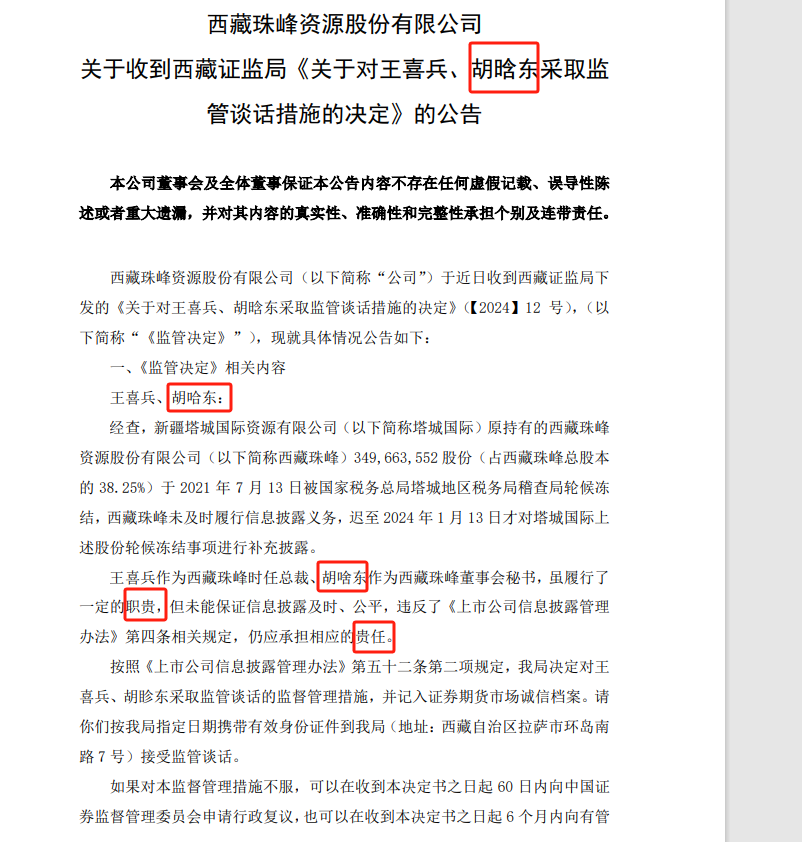 到底叫“胡啥東”?一份公告四次寫錯董秘名字,西藏珠峯遭監管警示