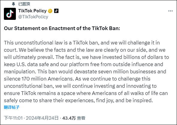 在拜登簽署法律後,TikTok官方賬號(TikTok Policy)4月24日在X平台發佈聲明:“這項違憲的法律是對TikTok的禁令,我們將在法庭上對其提出質疑。我們相信事實和法律顯然站在我們這邊,我們最終會獲勝。事實上,我們已投資數十億美元,以確保美國數據的安全,使我們的平台免受外部影響和操縱。”