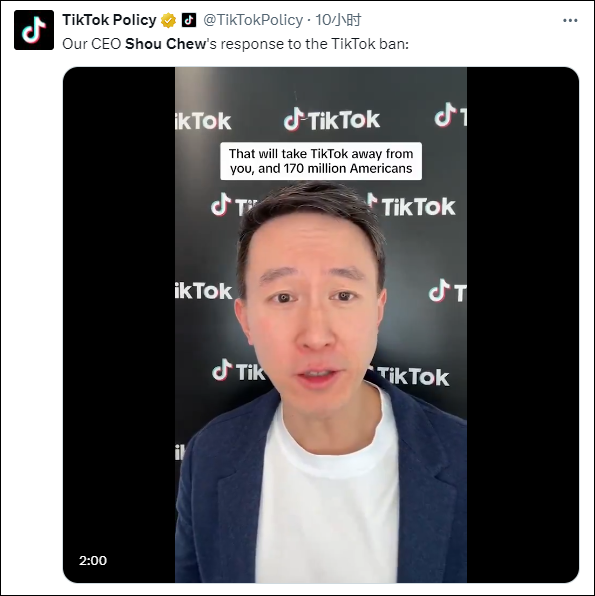 “政客們可能另有説法,但不要懷疑,許多支持該法案的人已承認,禁止Tiktok才是最終目標。”同日,TikTok首席執行官周受資也發佈回應視頻表示,這顯然是一個令人失望的時刻,但不一定是一個決定性的時刻。“請放心,我們不會離開”,“我們有信心,將繼續在法庭上為你們的權利而戰”,“事實和憲法站在我們這邊,我們期望着再次獲勝”,他向眾多TikTok用户喊話。