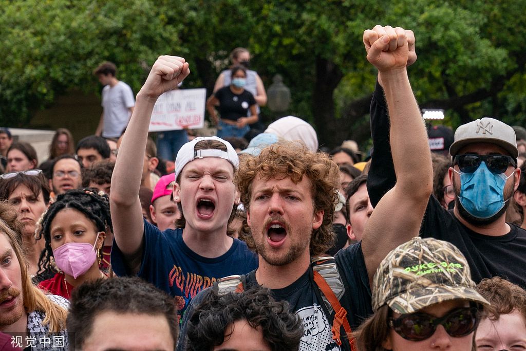 當地時間4月25日,美國得克薩斯州奧斯汀,反對加沙戰爭的示威者在得克薩斯大學校園內集會 圖源:視覺中國