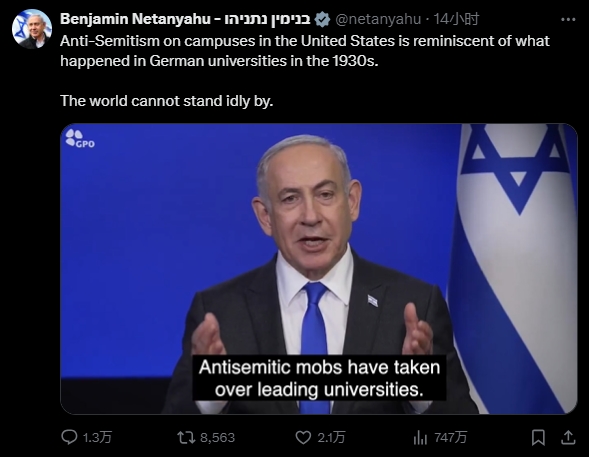 面對學生們的和平示威和停戰呼聲,內塔尼亞胡24日發表聲明,將示威學生們稱作“反猶暴徒”,並要求美國政府和高校校長予以譴責和制止。