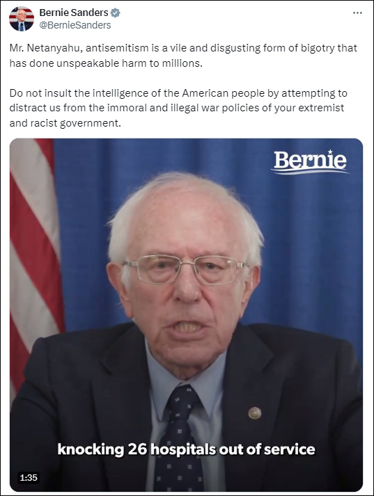 桑德斯怒懟內塔尼亞胡:別拿“反猶”轉移人們對加沙的注意力,這是侮辱我們智商