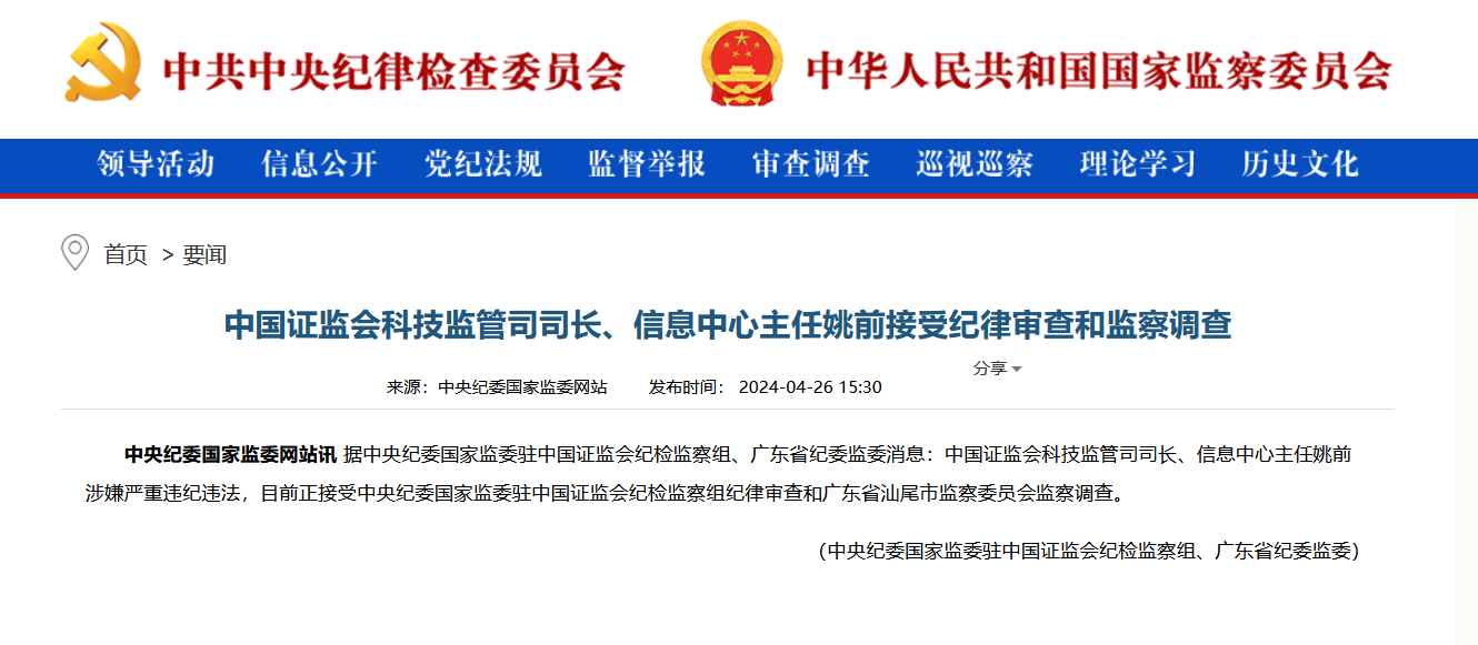 據中央紀委國家監委網站26日援引中央紀委國家監委駐中國證監會紀檢監察組、廣東省紀委監委消息:中國證監會科技監管司司長、信息中心主任姚前涉嫌嚴重違紀違法,目前正接受中央紀委國家監委駐中國證監會紀檢監察組紀律審查和廣東省汕尾市監察委員會監察調查。
