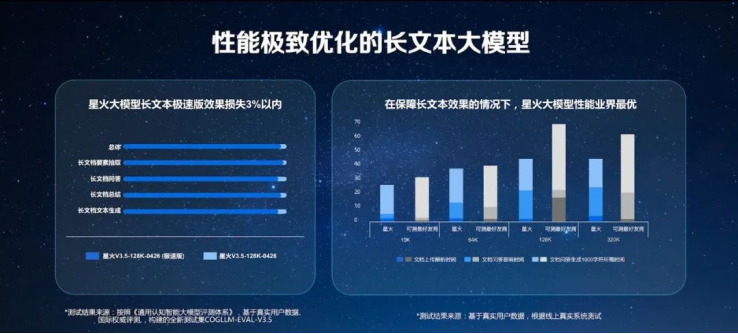 測試顯示,在保障長文本效果的情況下,無論是10K、64K、128K token,還是更長的文本上,星火大模型的性能都做到業界最優。