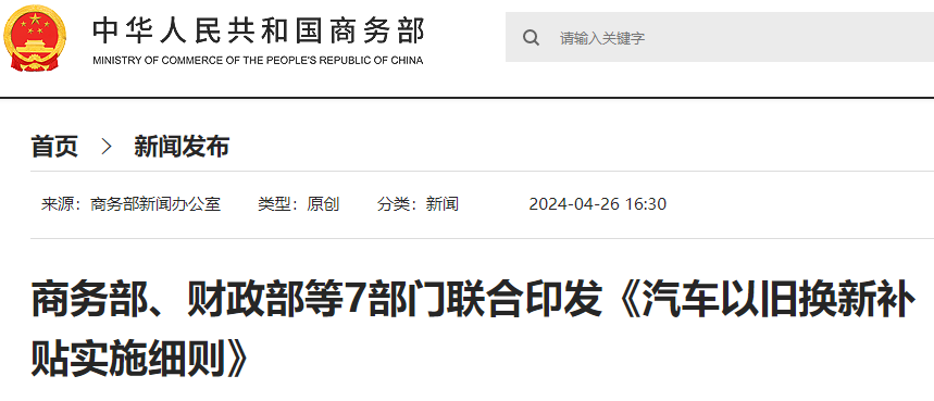 據商務部網站26日消息,為貫徹落實黨中央、國務院決策部署,按照《商務部等14部門關於印發<推動消費品以舊換新行動方案>的通知》(商消費發〔2024〕58號)要求,近日,商務部、財政部等7部門聯合印發了《汽車以舊換新補貼實施細則》(以下簡稱《細則》),明確了汽車以舊換新資金補貼政策。