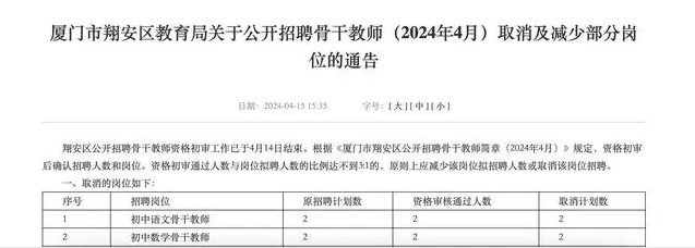 廈門市翔安區教育局發佈的一則《關於公開招聘骨幹教師(2024年4月)取消及減少部分崗位的通告》,引發不少討論。