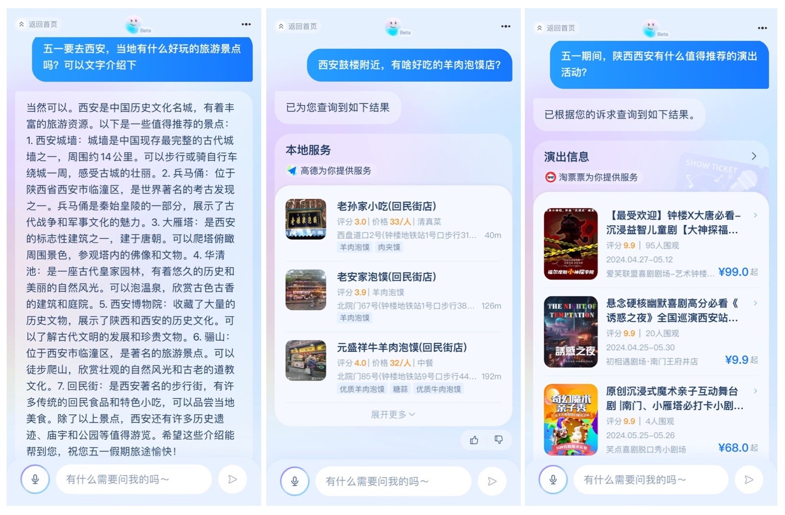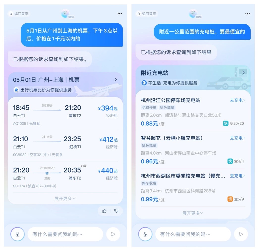 比如五一假期要來了,用户可以用文字或語音簡單輸入一句話,就能根據時間、價格等指定需求,5秒內快速找到相應的車票或飛機票;自駕遊的車主,也能根據你的實時位置,精準查詢距離最近、價格最優惠的充電樁和加油站。