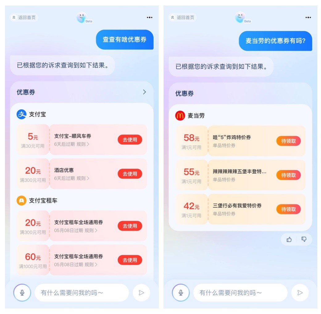 依託支付寶的商業生態,它還能迅速找到各種商家提供的優惠券、租車券等福利,出遊省心也能省錢。
