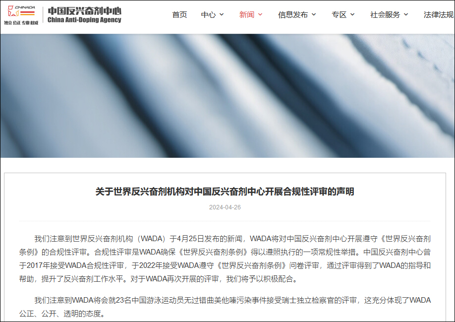 中國反興奮劑中心網站26日發佈《關於世界反興奮劑機構對中國反興奮劑中心開展合規性評審的聲明》。