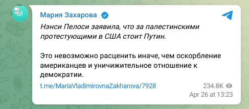 26日,扎哈羅娃在社交平台上寫道:“佩洛西表示,普京支持美國親巴勒斯坦抗議者。這隻能被視為對美國人的侮辱和對民主的貶低。”