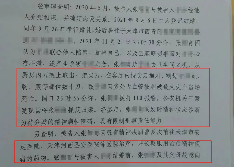 天津市第一中級人民法院的一審判決書顯示,法院審理查明,2020年5月,張某育與小洋經他人介紹相識,並確定戀愛關係。2021 年8月6日二人登記結婚,同年9月 26日舉行婚禮。2021年11月21日23時30分許,張某育因認為小洋聯合他人陷害、加害自已,以及因家庭瑣事而對小洋心存不滿,遂產生殺害小洋之念。張某育趁小洋去衞生間之機,從廚房內刀架上取出一把尖刀,在客廳內持尖刀捅刺、割劃小洋多部位數十刀,致小洋因多處大血管被刺破致大失血當場死亡。同日23時56 分許,張某育撥打110報警,公安機關於案發現場將張某育抓獲歸案。
