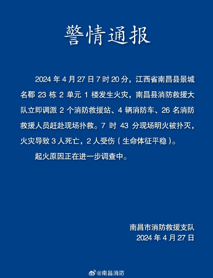 據微博@南昌消防 27日消息,江西南昌消防支援支隊通報稱,南昌一小區發生火災,造成3人死亡2人受傷,明火已被撲滅。