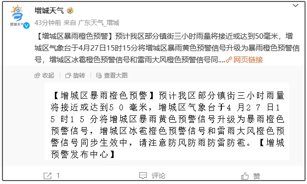 稍早前,廣州增城區發佈暴雨橙色預警稱,預計增城區部分鎮街三小時雨量將接近或達到50毫米,增城區氣象台於4月27日15時15分將增城區暴雨黃色預警信號升級為暴雨橙色預警信號,增城區冰雹橙色預警信號和雷雨大風橙色預警信號同步生效中,請注意防風防雨防雷防雹。