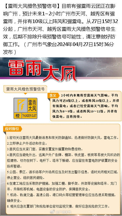 同日,@廣州天氣 發佈雷雨大風橙色預警信號: