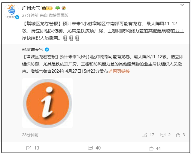 廣州市增城區氣象公共服務中心官方微博@增城天氣 4月27日消息,增城氣象台當天15時23分發布龍捲警報,預計未來1小時增城區中南部可能有龍捲,最大陣風11-12級。請立即組織防禦,尤其是鐵皮頂廠房、工棚和防風能力差的其他建築物的業主儘快組織人員撤離。