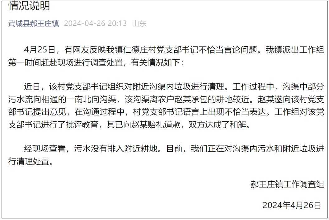 山東武城縣郝王莊鎮官方微信公眾號4月26日發佈情況説明: