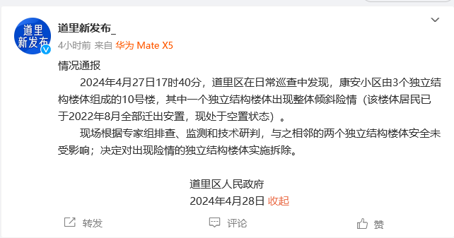 2024年4月27日17時40分,道里區在日常巡查中發現,康安小區由3個獨立結構樓體組成的10號樓,其中一個獨立結構樓體出現整體傾斜險情(該樓體居民已於2022年8月全部遷出安置,現處於空置狀態)。