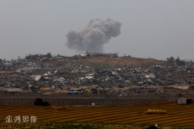 當地時間4月25日,以色列,以軍發動空襲,遠處加沙上空升起濃煙。圖自澎湃影像