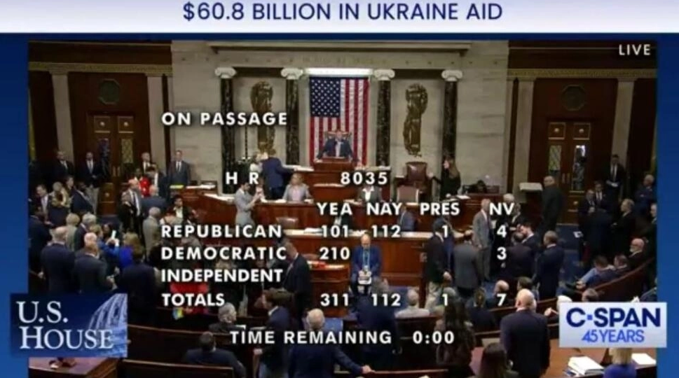 4月20日,美國國會眾議院以311比112票通過《2024年烏克蘭安全補充撥款法案》。視頻截圖