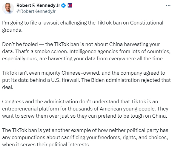 據美國《國會山報》4月26日報道,美國獨立總統候選人小羅伯特·肯尼迪當天在社交媒體X上表示,美國政府對TikTok的剝離法案違反憲法,他計劃向美國法院提起訴訟。他指責拜登政府通過禁令“假裝對華強硬”,損害美國公民的利益。
