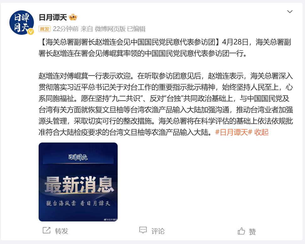 趙增連對傅崐萁一行表示歡迎。在聽取參訪團意見後,趙增連表示,海關總署深入貫徹落實習近平總書記關於對台工作的重要指示批示精神,始終堅持人民至上,心繫同胞福祉。願在堅持“九二共識”、反對“台獨”共同政治基礎上,與中國國民黨及台灣有關方面就恢復文旦柚等台灣農漁產品輸入大陸加強溝通,推動台灣業者加強源頭管理,採取切實可行的整改措施。海關總署將在科學評估的基礎上依法依規批准符合大陸檢疫要求的台灣文旦柚等農漁產品輸入大陸。