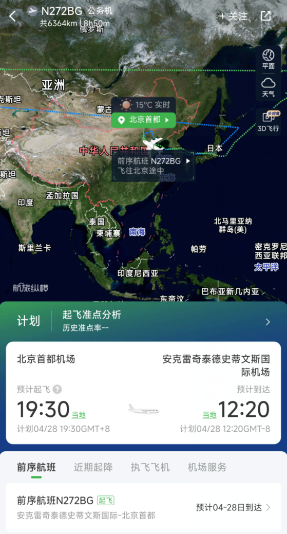 據“航旅縱橫”APP信息顯示,一架尾號為N272BG的灣流私人飛機於4月28日降落在北京首都機場,這架飛機註冊於與SpaceX和特斯拉有關聯的獵鷹着陸公司。