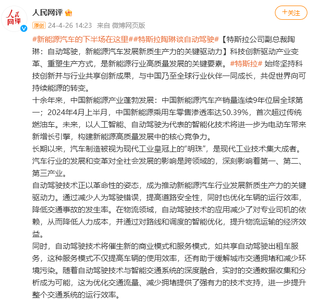值得一提的,就在4月26日,即北京車展開幕第二天,特斯拉對外關係副總裁陶琳在人民網網絡評論部官方微博@人民網評 上發表了一篇評論,認為以人工智能、自動駕駛為代表的智能化技術將進一步為電動車帶來新增長引擎,構建新能源高質量發展中的核心競爭力。