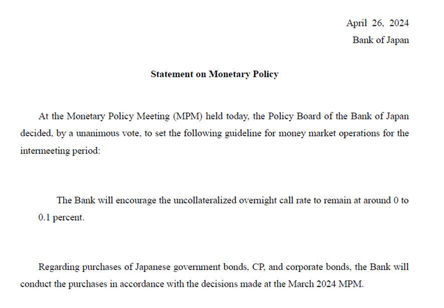 面對日元的加速貶值趨勢,市場預期在4月26日日本央行的利率決議上,日本央行將為了捍衞日元匯率宣佈某些措施。然而日本央行最終交出了一份讓人大感震撼的答卷。