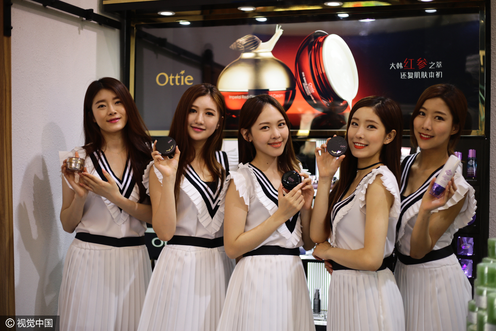 上海美博會上展示韓國品牌化妝品的模特/視覺中國