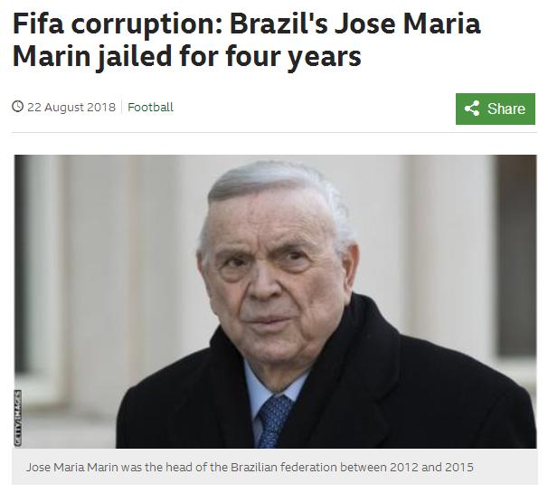 但與之形成鮮明對比的是,雖然有前後六名巴西足協主席與各種違法犯罪打上“交道”,但他們中真正坐了大牢的,只有2012-2015年間擔任巴西足協主席的若澤·馬林一人,而這老哥坐牢坐的也不是巴西的牢,而是美國的牢——馬林因為在一樁涉及1.5億美元、與美國及南美多國相關的足球腐敗案件中惹得“友邦震怒”,直接被美國司法部門聯合瑞士司法部門逮捕,並且由美國紐約州法院判了其四年監禁(2020年因為身體原因和疫情影響提前釋放)。