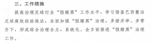 4月14日,江蘇省體育局網站轉發國家體育總局《治理足球行業“假賭黑”工作方案》,該文件第三條“工作措施”稱,要提高治理足球行業“假賭黑”工作水平,學習借鑑巴西整治足球腐敗經驗做法,全面加強“假賭黑”治理,多措並舉、多管齊下,形成綜合治理合力,系統化、全方面推進“假賭黑”治理工作。
