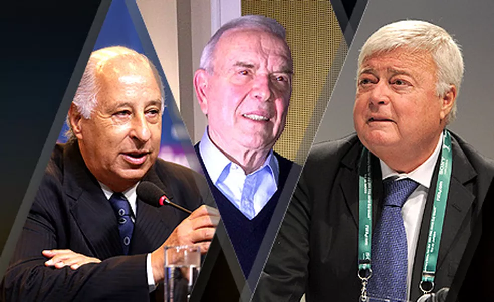 “巴西足球腐敗多米諾三巨頭”,從右至左分別為特謝拉、馬林和德爾內羅