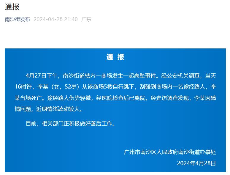 4月28日,網傳“廣州一女子商場跳樓砸中路人”,對此,廣州市南沙區人民政府南沙街道辦事處當天發佈通報稱,27日下午,南沙街道轄內一商場發生一起高墜事件。