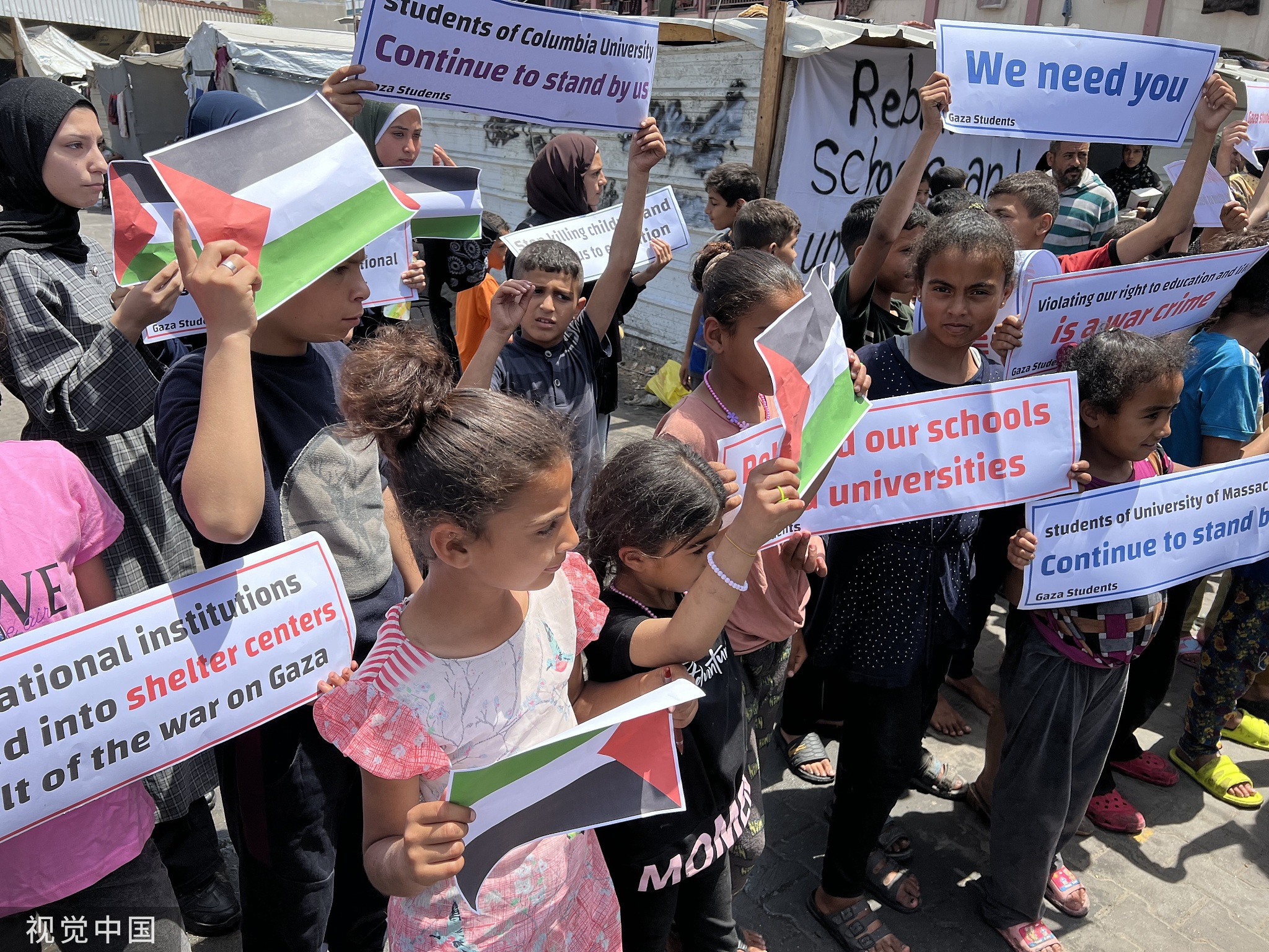報道稱,巴勒斯坦學生和兒童聚集在沙布拉難民營一所學校旁的臨時帳篷,舉起了抗議以色列和感謝美國學生的橫幅。這些橫幅上寫着“哥倫比亞大學的學生,請繼續支持我們”、“侵犯我們的受教育權和生命權是一種戰爭罪”、“重建我們的學校和大學”等口號。