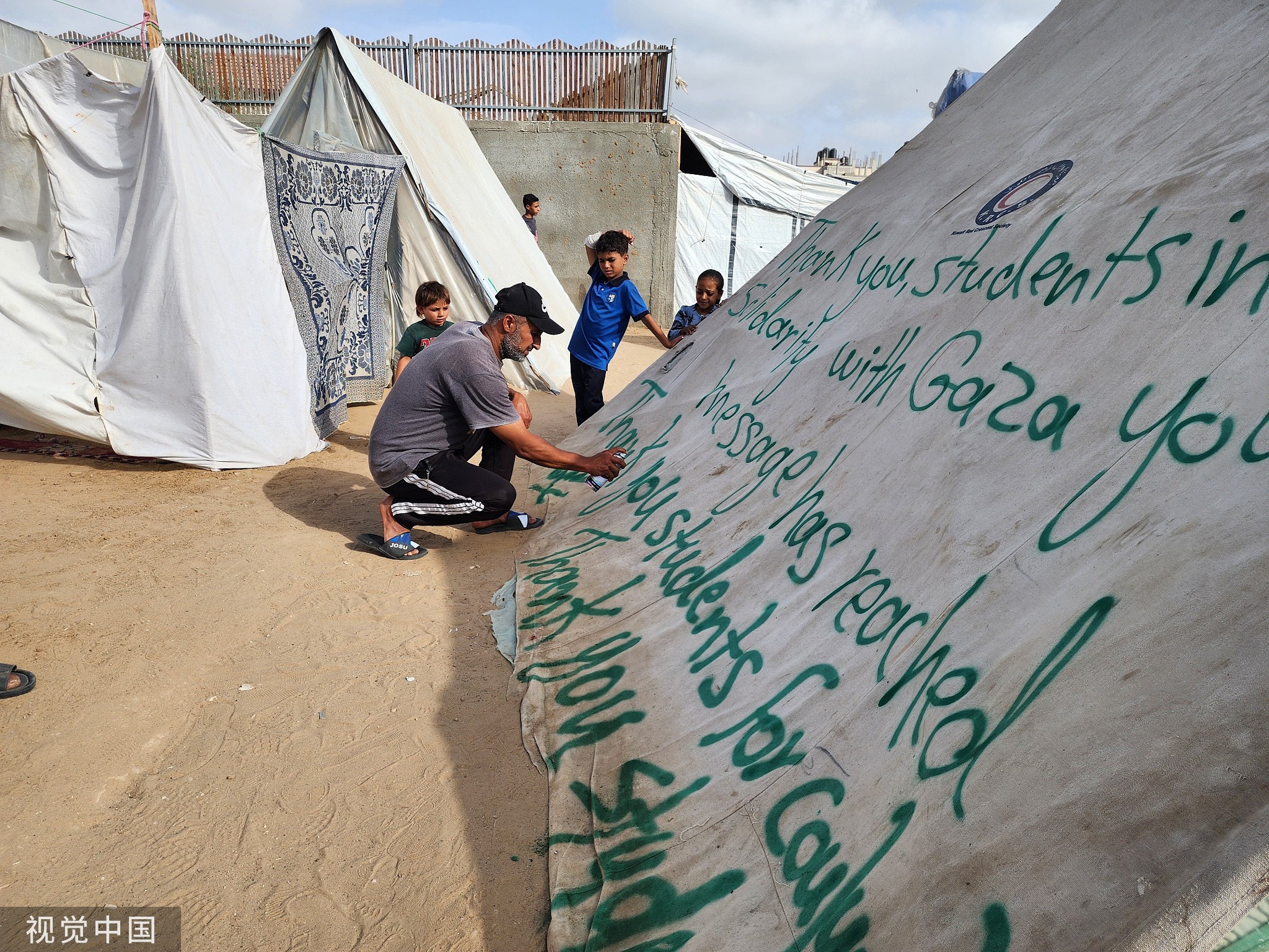 巴勒斯坦人在帳篷上噴塗標語,感謝美國抗議學生 圖源:視覺中國