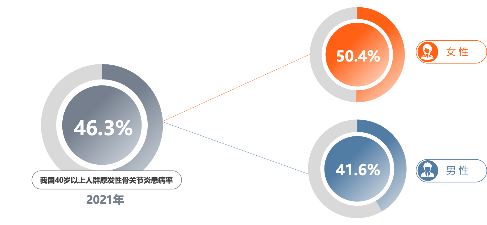 數據顯示2021年中國骨科醫院執業醫師人數為1.55萬,骨科醫院執業(助理)醫師人數為1.88萬③。然而,2021年,40歲以上人羣原發性骨關節患病率高達46.3%,其中女性佔50.4%、男性為41.6%④。