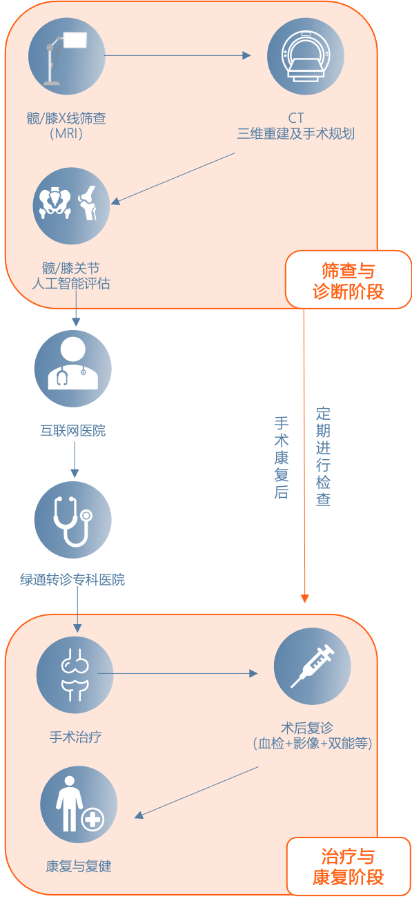 客户只要拍攝一張下肢關節的X光片,就能完成一系列骨關節健康評估;對於可能需要關節置換的患者,通過骨關節CT影像進行三維重建,精準匹配人工關節並提供手術方案,之後為患者3D打印手術導板,對接到骨科專科醫院進行手術。