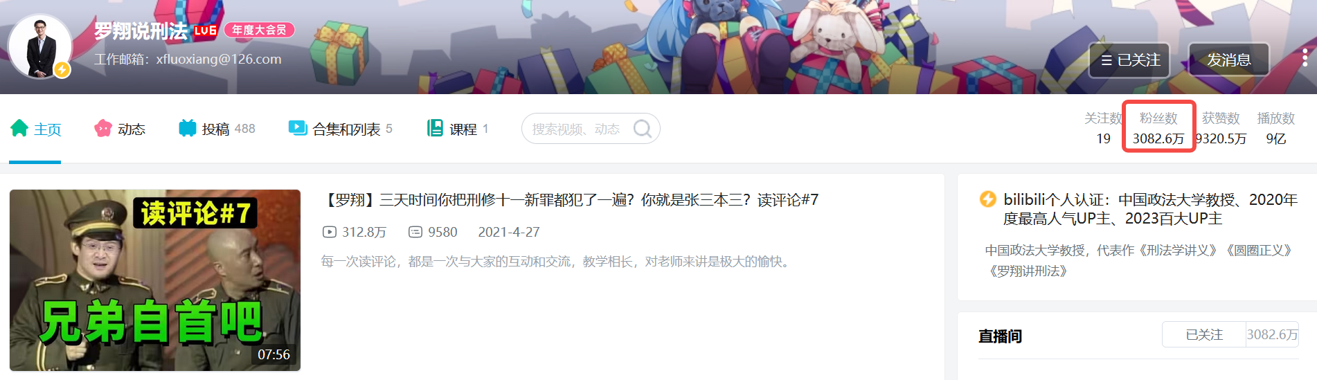 羅翔在B站上擁有驚人的3000多萬粉絲