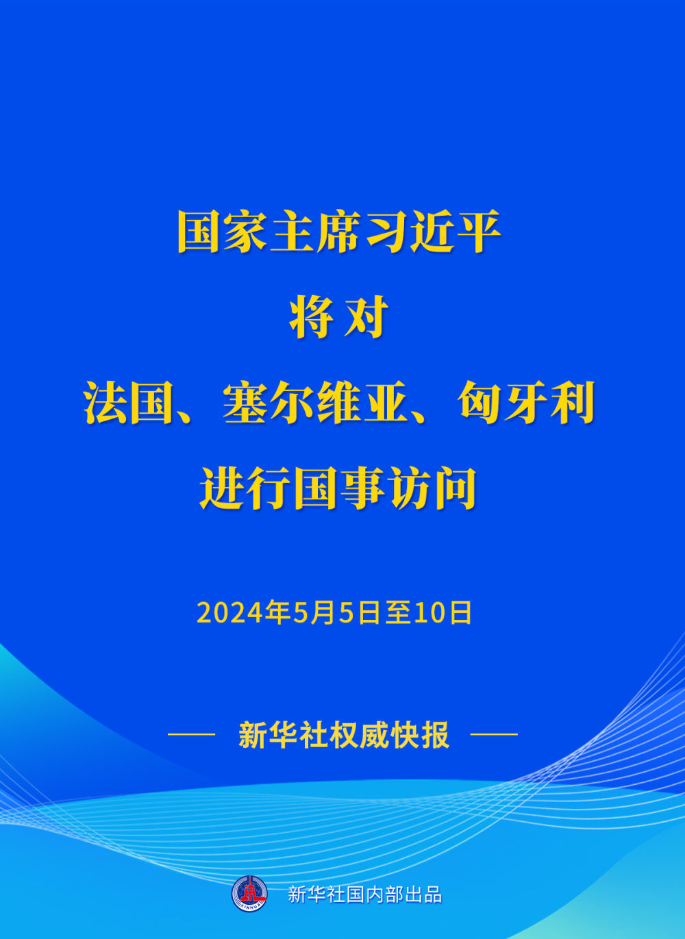新華社權威快報 | 習近平將對法國、塞爾維亞、匈牙利進行國事訪問 guancha 2024-04-29 外交部發言人華春瑩4月29日宣佈:應法蘭西共和國總統馬克龍、塞爾維亞共和國總統武契奇、匈牙利總統舒尤克和總理歐爾班邀請,國家主席習近平將於5月5日至10日對上述三國進行國事訪問。