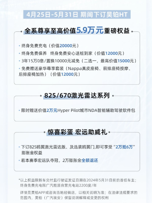 此外,在4月25日-5月31日期間下定的首任昊鉑車主,全系尊享包括終身免費充電、免費保養、豪華尊享套裝等在內的至高價值5.9萬元重磅權益。