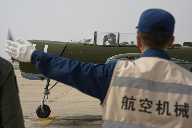 2024年4月25日,我國首批艦載機女飛行學員首次單飛。這是飛行學員向機務人員示意準備滑出。(陳超 攝)