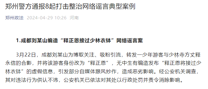 據微信公眾號“鄭州政法”29日消息,鄭州警方通報8起打擊整治網絡謠言典型案例,其中包括成都劉某山編造“釋正恩接過少林衣缽”網絡謠言案。