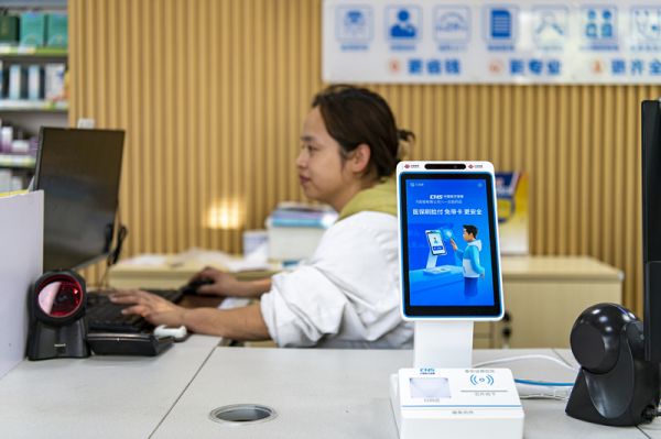 2024年4月10日,浙江金華市區一家民眾大藥房櫃枱上放着醫保“刷臉支付”設備,羣眾看病更加便利。