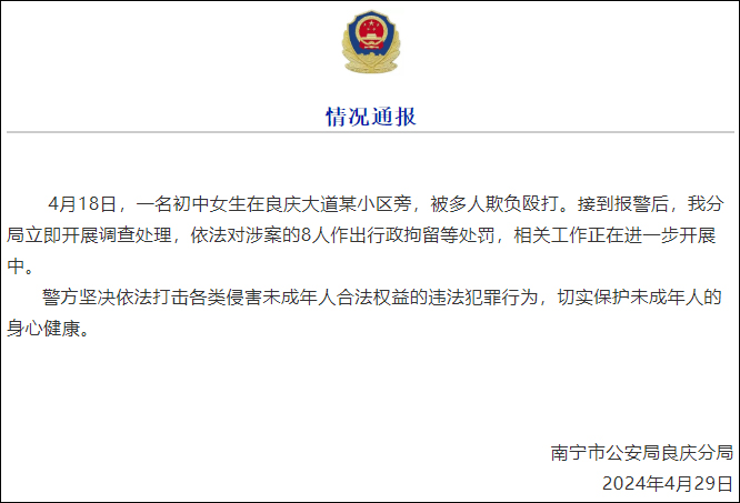 廣西南寧市公安局良慶分局微信公眾號“良慶警方”4月29日發佈情況通報稱,4月18日,一名初中女生在良慶大道某小區旁,被多人欺負毆打。接到報警後,我分局立即開展調查處理,依法對涉案的8人作出行政拘留等處罰,相關工作正在進一步開展中。