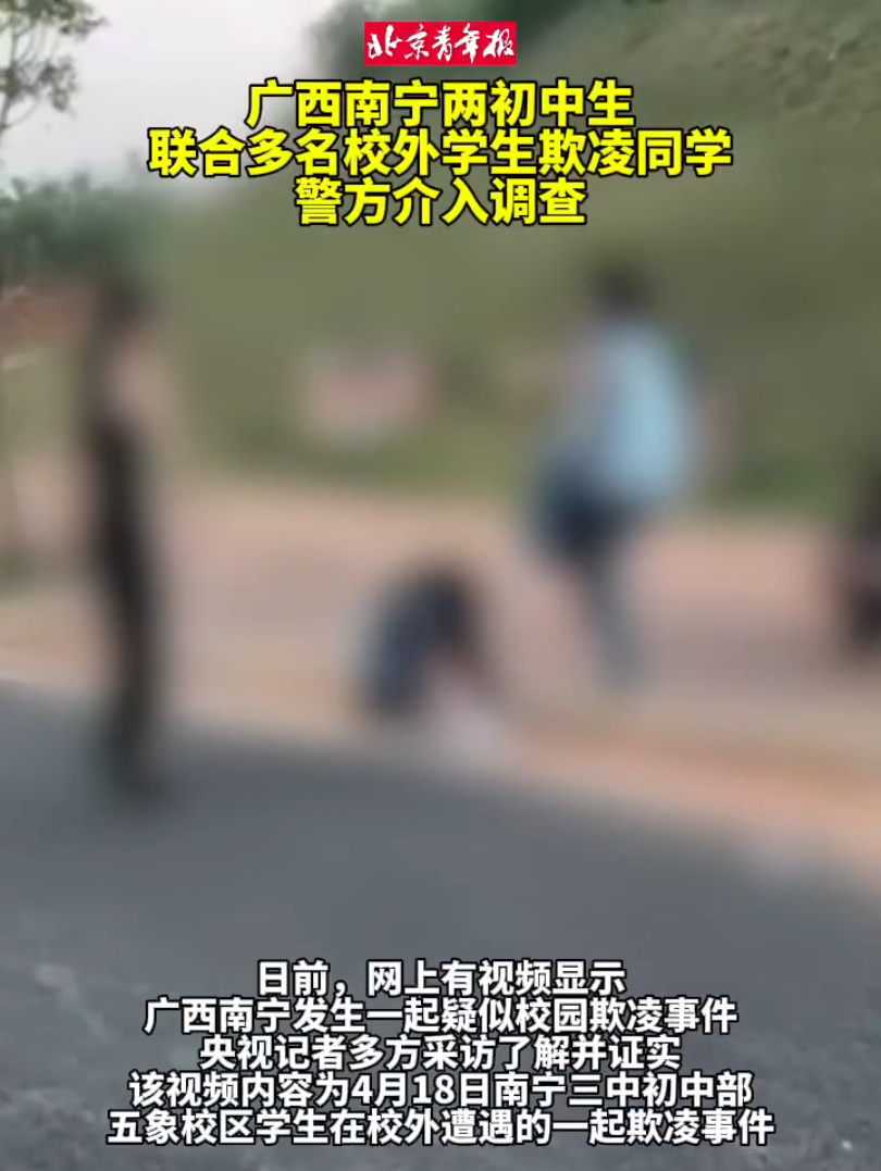 據央視新聞客户端此前報道,日前,網上有視頻顯示,廣西南寧發生一起疑似校園欺凌事件。記者多方採訪瞭解並證實,該視頻內容為4月18日南寧三中初中部五象校區學生在校外遭遇的一起欺凌事件。