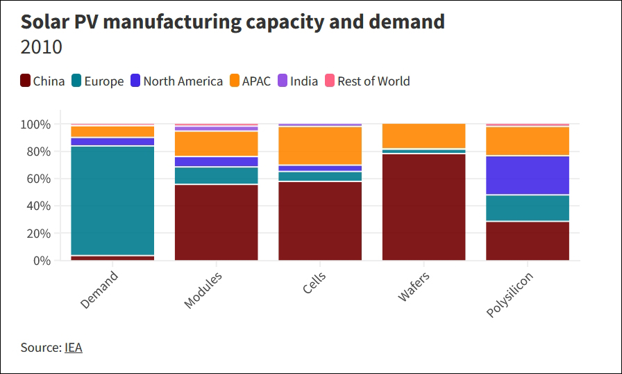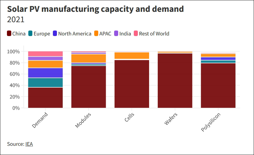 太陽能光伏產業各環節產能與需求,紅色為中國 圖片來源:“外交學者”網站